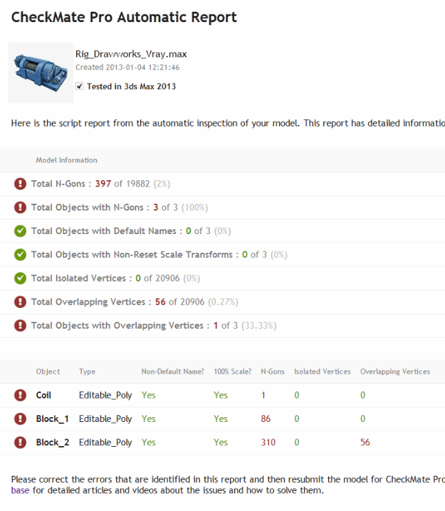 From now on, whenever you submit a native 3ds Max model for CheckMate Pro, our script will automatically check for certain points such as N-Gons, Default Names, and Overlapping Vertices. If your model fails on any of these points you’ll receive an email, usually within an hour or less, outlining what needs to be fixed. At the end of the email is a link to a full report on everything that was found, both passing and failing.